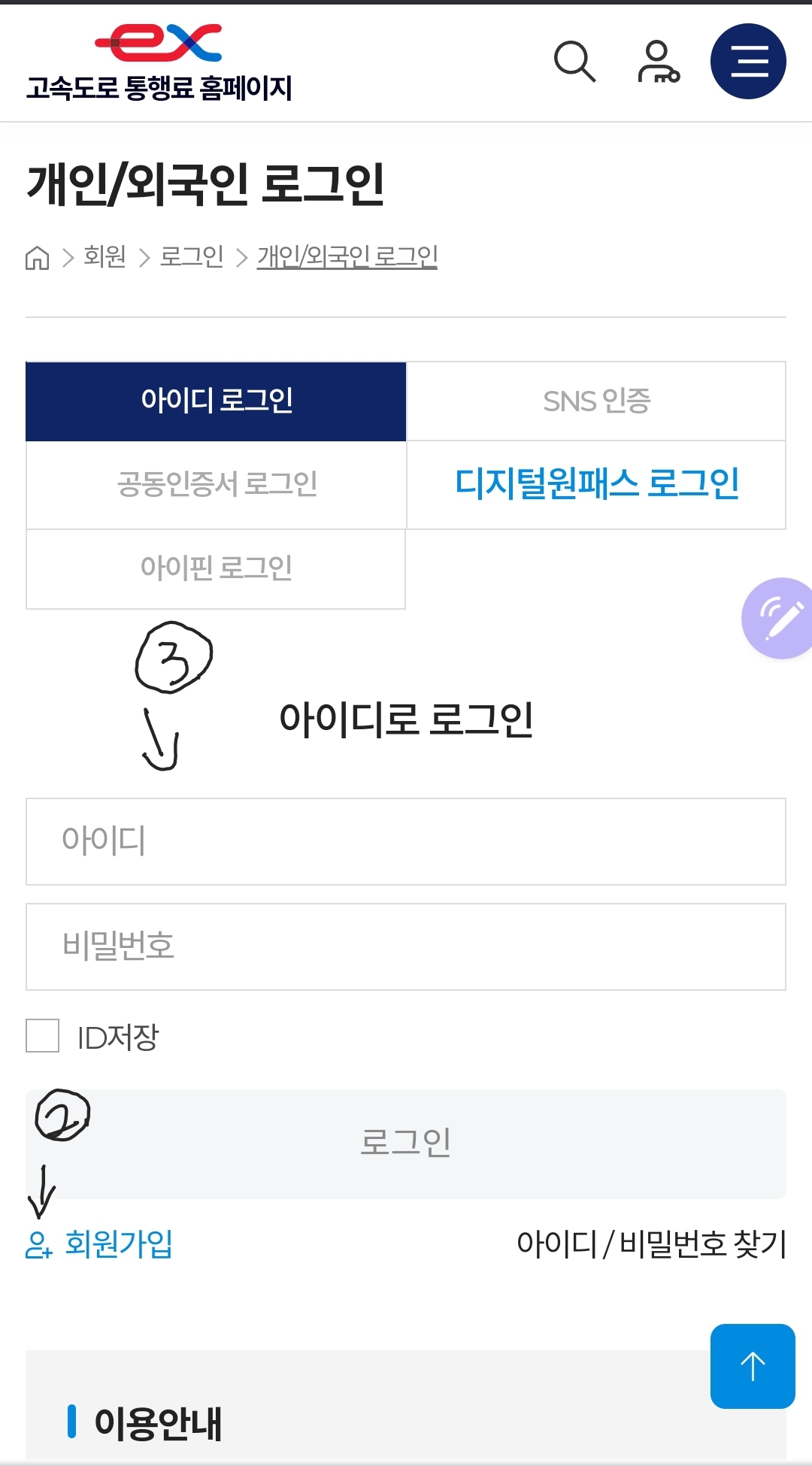 1) 사람 모양을 누르시면 로그인 화면으로 넘어갑니다.